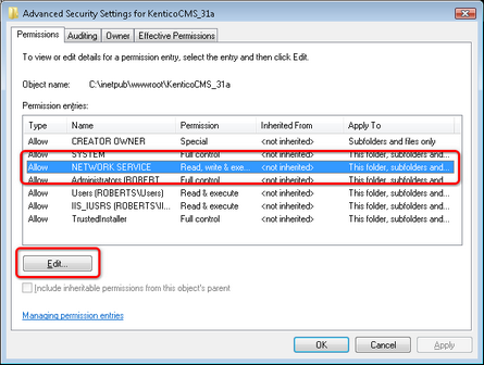 9. You have assigned the account with the required permissions. Kentico CMS should now be able to perform all disk write operations and therefore work correctly.