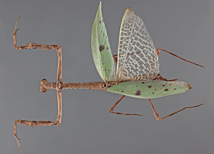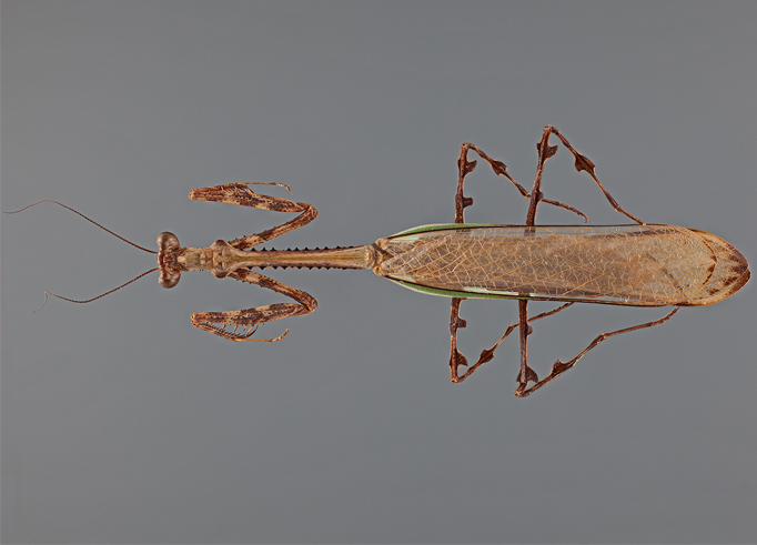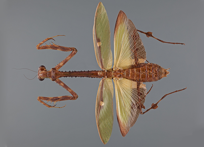 The scientists used DNA sequence data generated in the Museum’s DNA Laboratory and studied morphological features to reclassify the group. The newly identified genus, Alangularis, recognizes a unique and colorful species of praying mantis that was incorrectly included within another genus. The new genus name translates to “angled wings,” which reflects its acute wing tips. The new tribe, Heterovatini, was established to include two genera that share many characteristics with the rest of Vatinae, but retain no disruptive cryptic features other than the shared leg lobes.