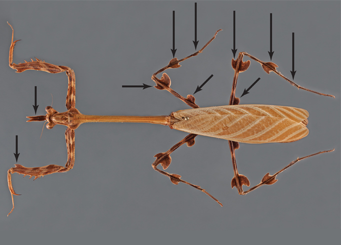 The research revealed that leafy lobes on the middle and hind legs evolved during the first origin of the horned mantises. Afterward, one lineage invested in a camouflage strategy and began to accumulate other leg lobes, an extended head process or horn, and even lobes on the abdomen, while the other lost these early evolved leg lobes and relied only on coloration to blend in with vegetation. However, a second, smaller lineage of mantises within this color camouflaged group began to gain disruptive cryptic features about 20 million years later after the re-evolution of those same early originating leg lobes. This second shift to a strategy of disruptive camouflage appears to have followed a remarkably similar path as the first through the accumulation of leg lobes in the same positions, as well as a similar extended head process or horn.