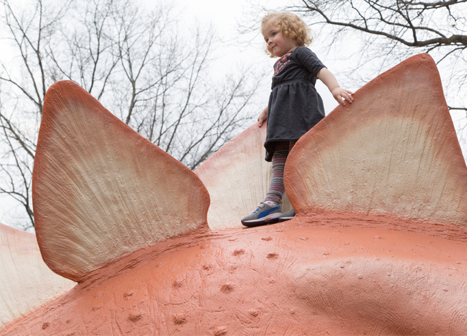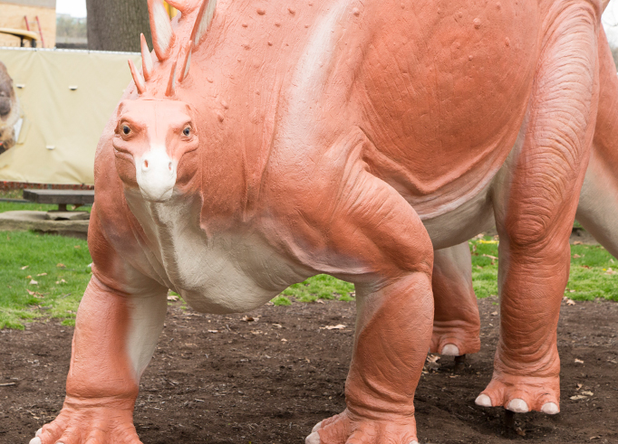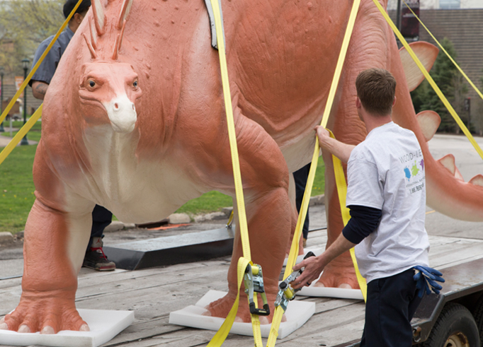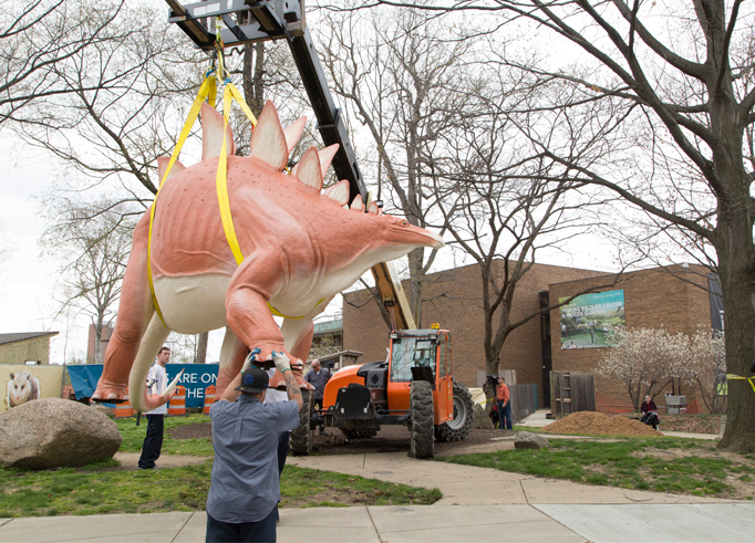 On Friday, April 1, the Museum’s iconic Stegosaurus sculpture—affectionately known to visitors and staff as “Steggie”—was temporarily transferred off-site for refurbishment and to receive a new color scheme more in line with current paleontology research on how dinosaurs were likely to look.