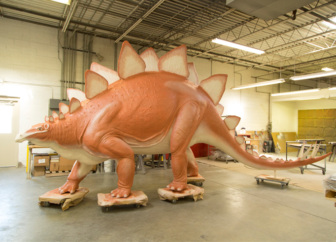 Stegosaurus might have looked based on these new hypotheses. The exhibits team then orchestrated a removal and transportation plan in conjunction with Wood-Lee International Art Handlers. A boom truck hoisted the massive sculpture onto a flatbed truck. Steggie was then delivered to Creative Mold and Machine in Newbury to receive minor repairs and the new paint job.