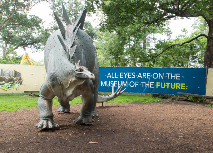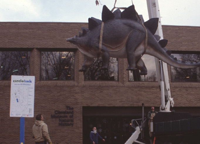 Stegosaurus to stand watch over Wade Oval. The Museum’s original Steggie was created by sculptors at Louis Paul Jonas Studios in Hudson, New York. In 1964, artists at Jonas Studios were commissioned to create a group of authentic life-sized dinosaur sculptures to be used at the New York World’s Fair. The studio created a 70-foot-long
