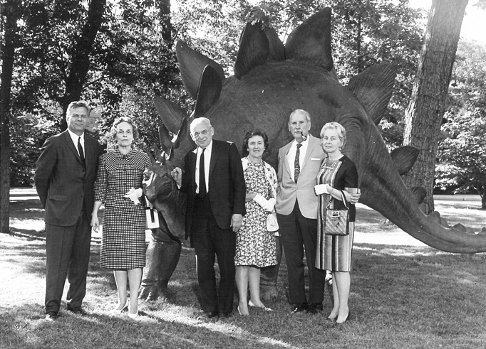 Stegosaurus dedication. Left to right - William E. Scheele, CMNH Director; Marie Odenkirk Clark, President of the Board; Dr. Alfred Romer, Harvard; Mrs. Alfred Romer; John Paul Jonas, sculptor; Mrs. J.P. Jonas